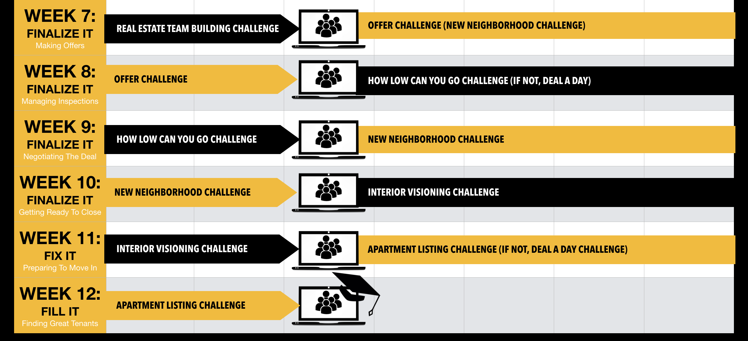 Get coached on our Weekly Deal Room calls where our coaches analyze deals and answer your real estate related questions.